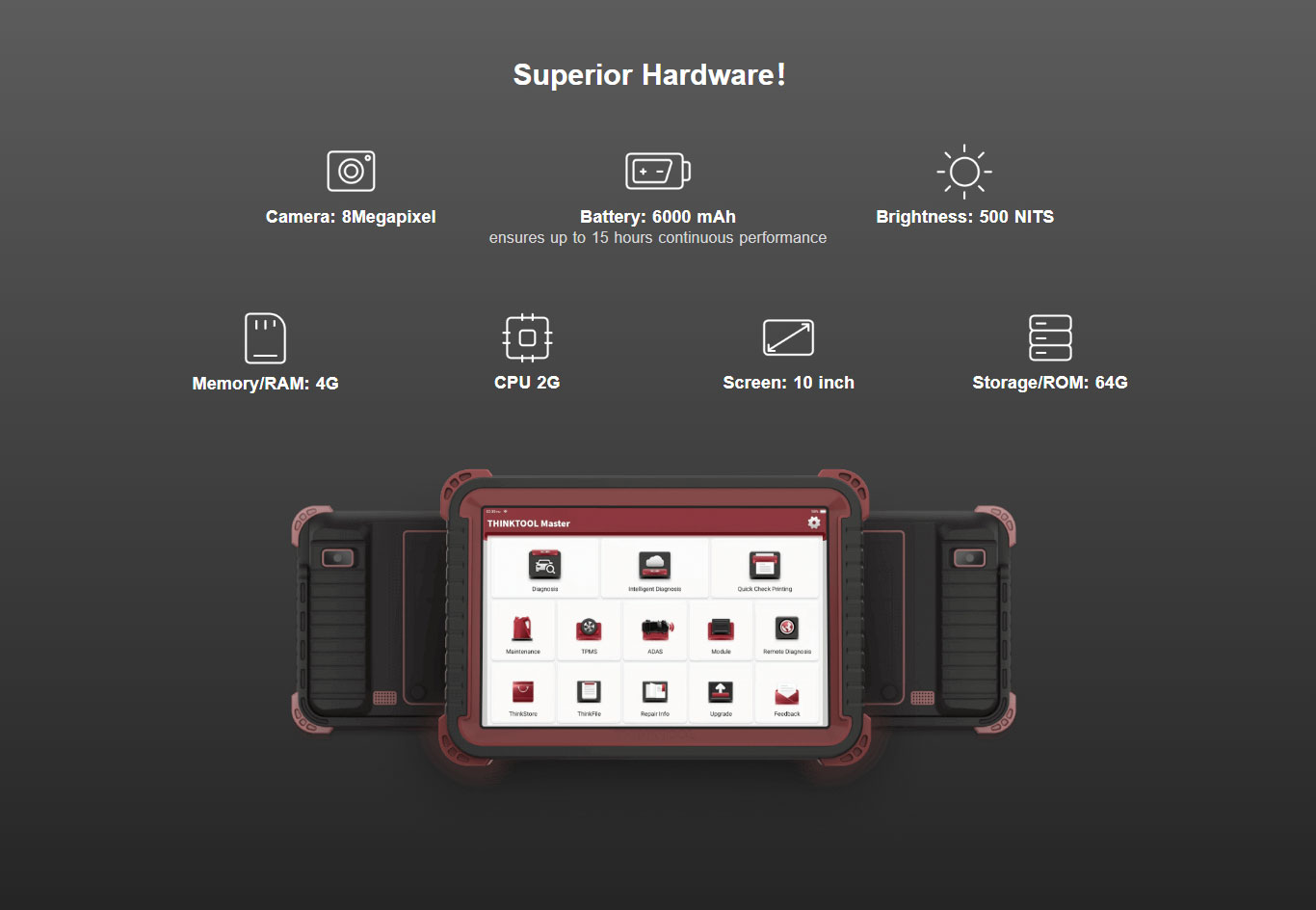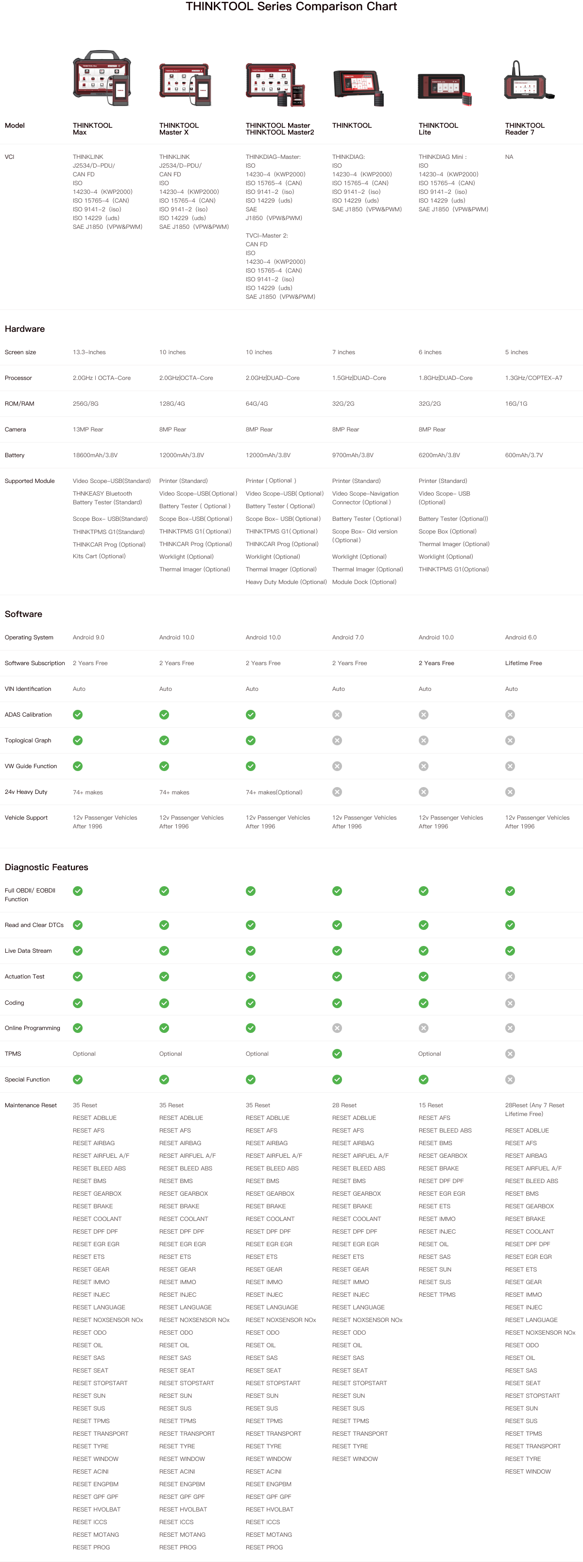 THINKTOOL Master provides complete functions for technicians, such as full vehicle scan, read and clear fault codes, live data stream, actuation tests, special functions, 35 maintenance reset functions and much more.