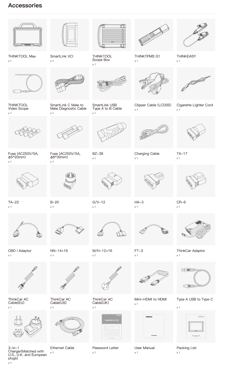 THINKTOOL MAX adopts the latest DoIP and CAN FD protocols as well as J2534, D-PDU, DoIP, ISO-15765, SAE-J1939, ISO-14229 UDS, SAE-J2411 Single Wire Can (GMLAN), ISO-11898-2, ISO-11898-3, SAE-J2819 (TP2.0), ISO-9141, ISO-14230, SAE-J2610 (Chrysler SCI), UART Echo Byte, SAE-J2809 (Honda Diag-H), SAE-J2740 (GM ALDL), SAE-J1567 (CCD BUS), Ford UBP, Nissan DDL UART with Clock, BMW DS2, BMW DS1, kwp128, SAE J1708, SAE-J1850 PWM (Ford SCP), SAE-J1850 VPW (GM Class2) protocols.