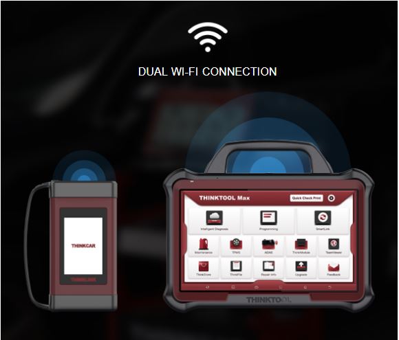 THINKTOOL MAX supports dual range Wi-Fi connection. The tablet communicates with the diagnostic box through Wi-Fi, allowing technicians to quickly operate diagnostics, checking fault code and other functions.